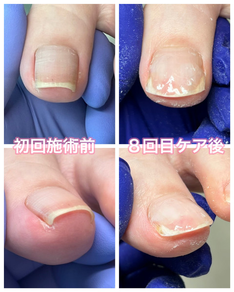 巻き込みが強かった爪が、継続的なケアによって自然な形へと変化しているのが分かります。